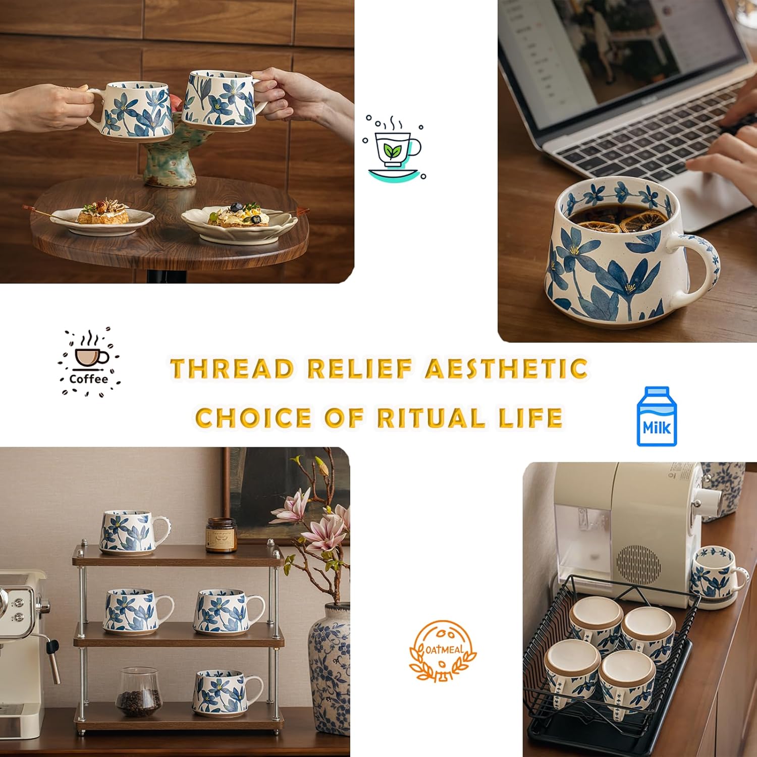 Nordic Ceramic Mug with Blue Floral Design – 13oz Large Coffee Tea Cup
